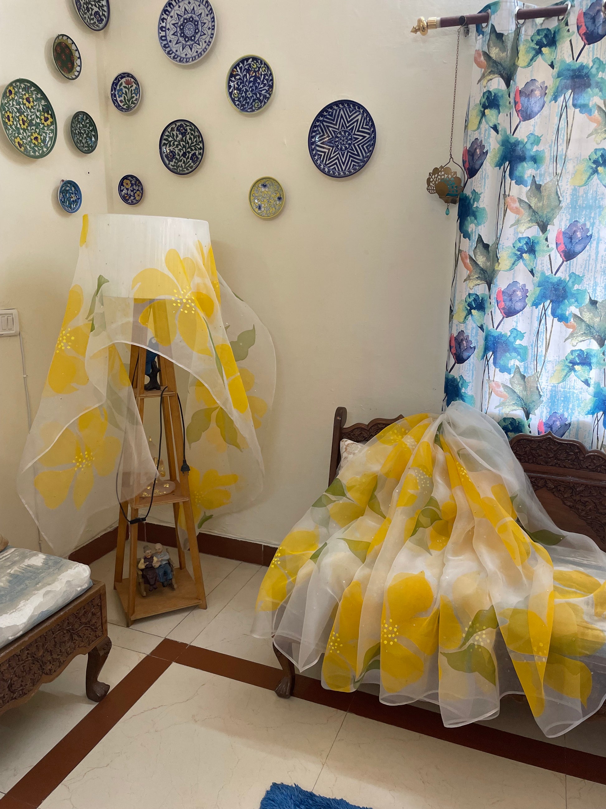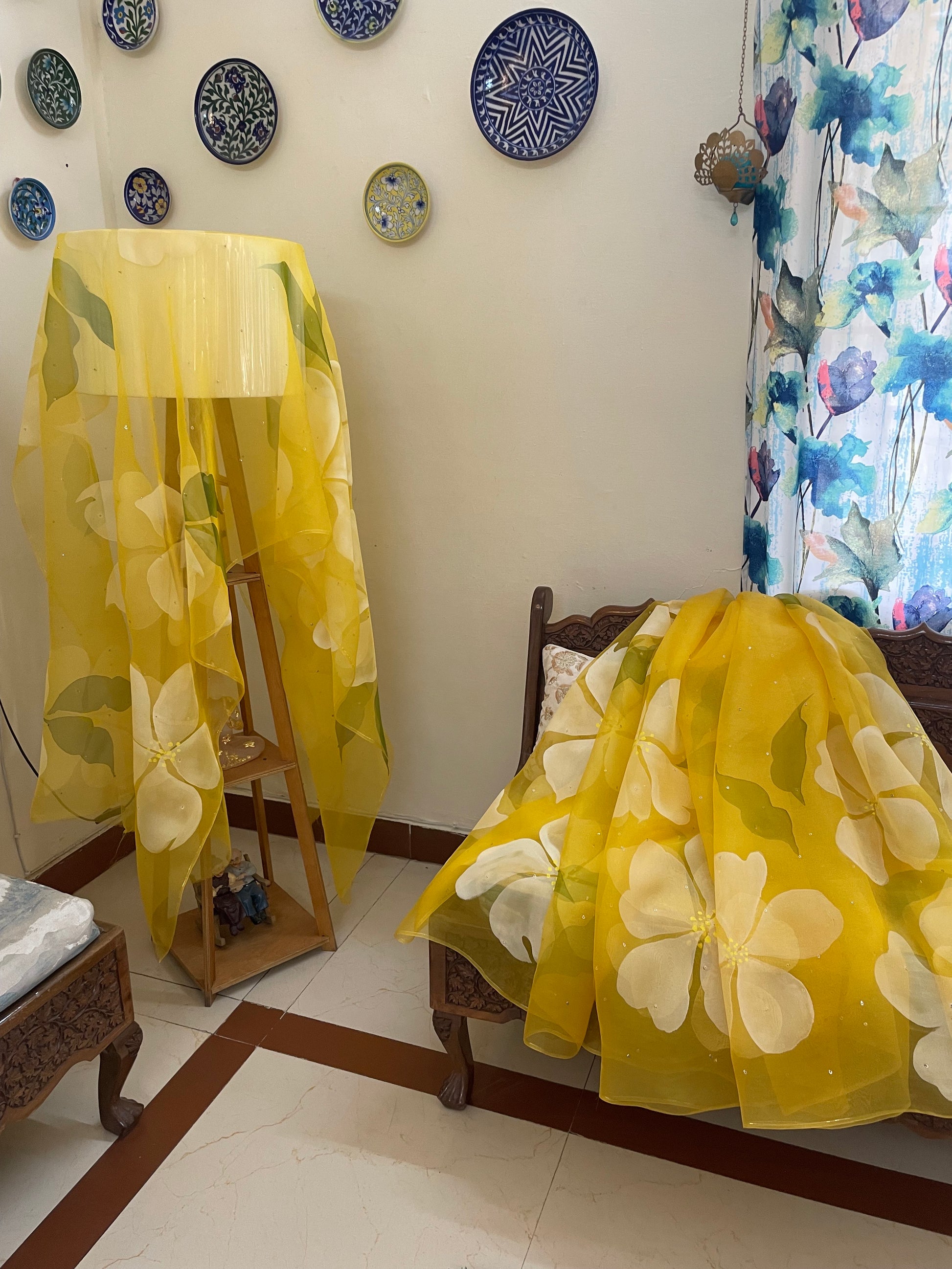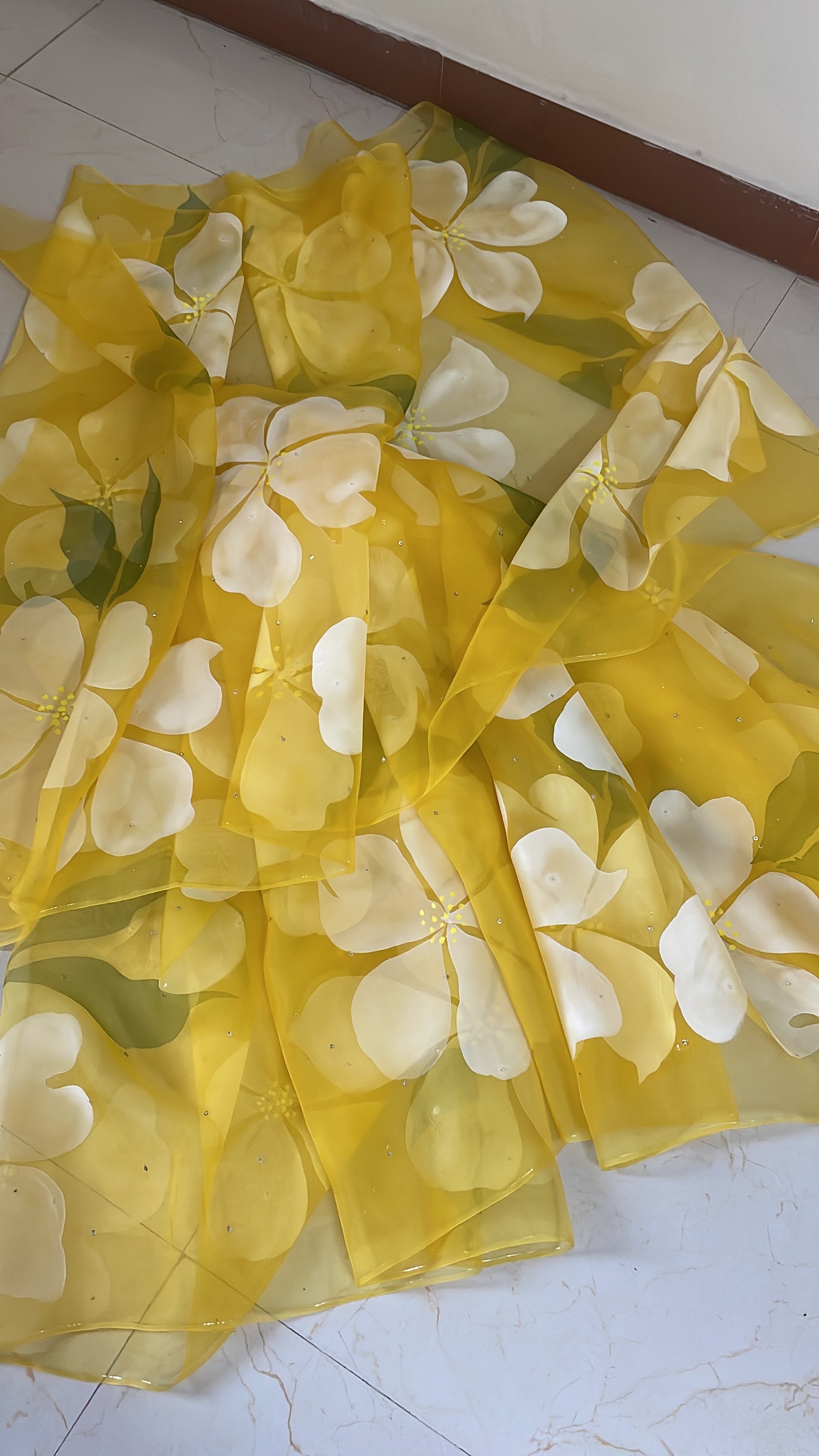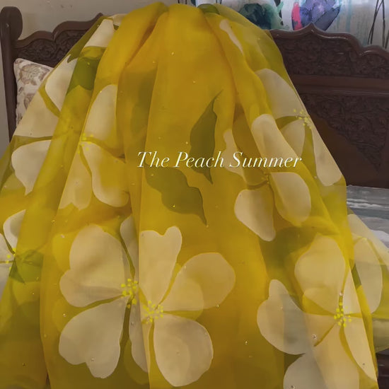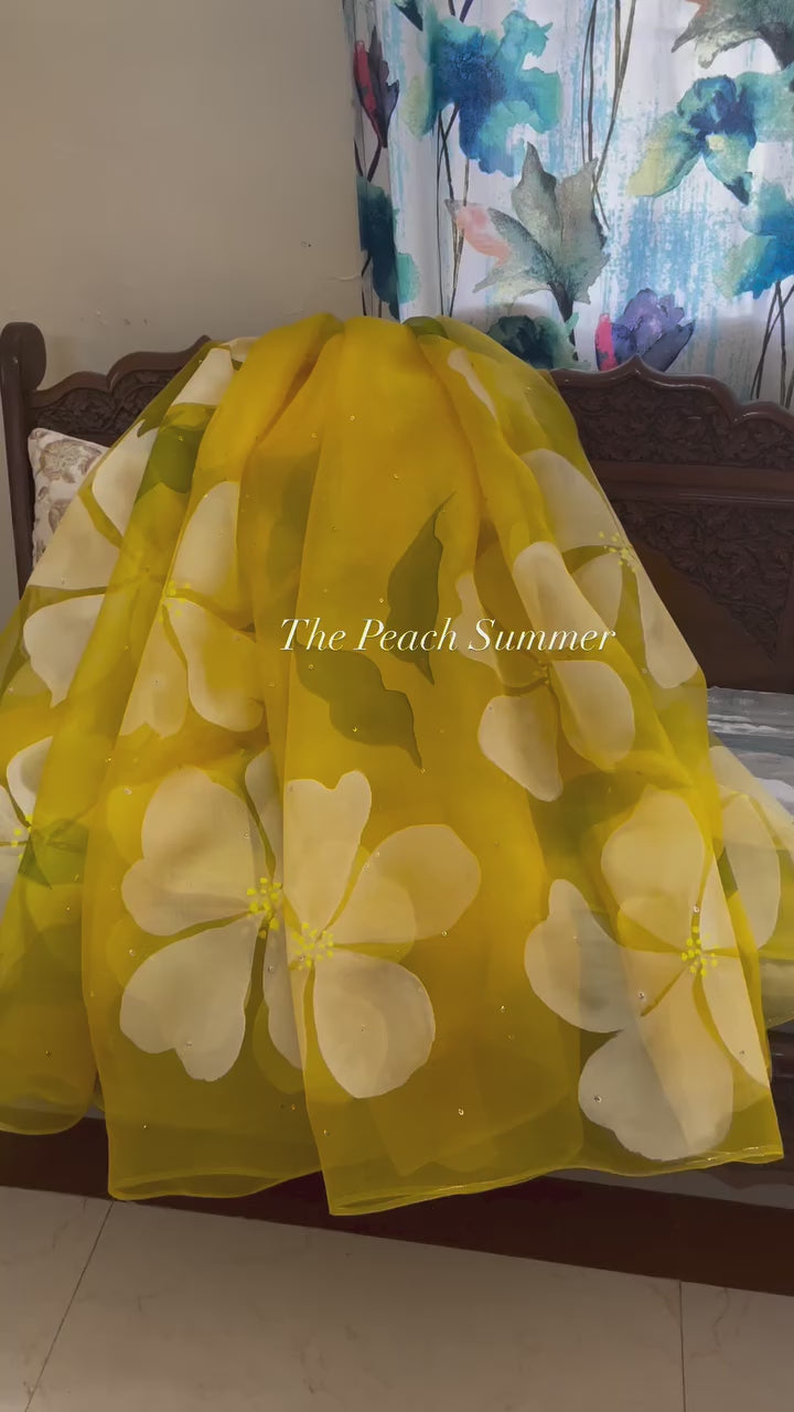 Elevate your style with our exquisite hand-painted hibiscus motif on pure silk organza, adorned with delicate golden sequins.