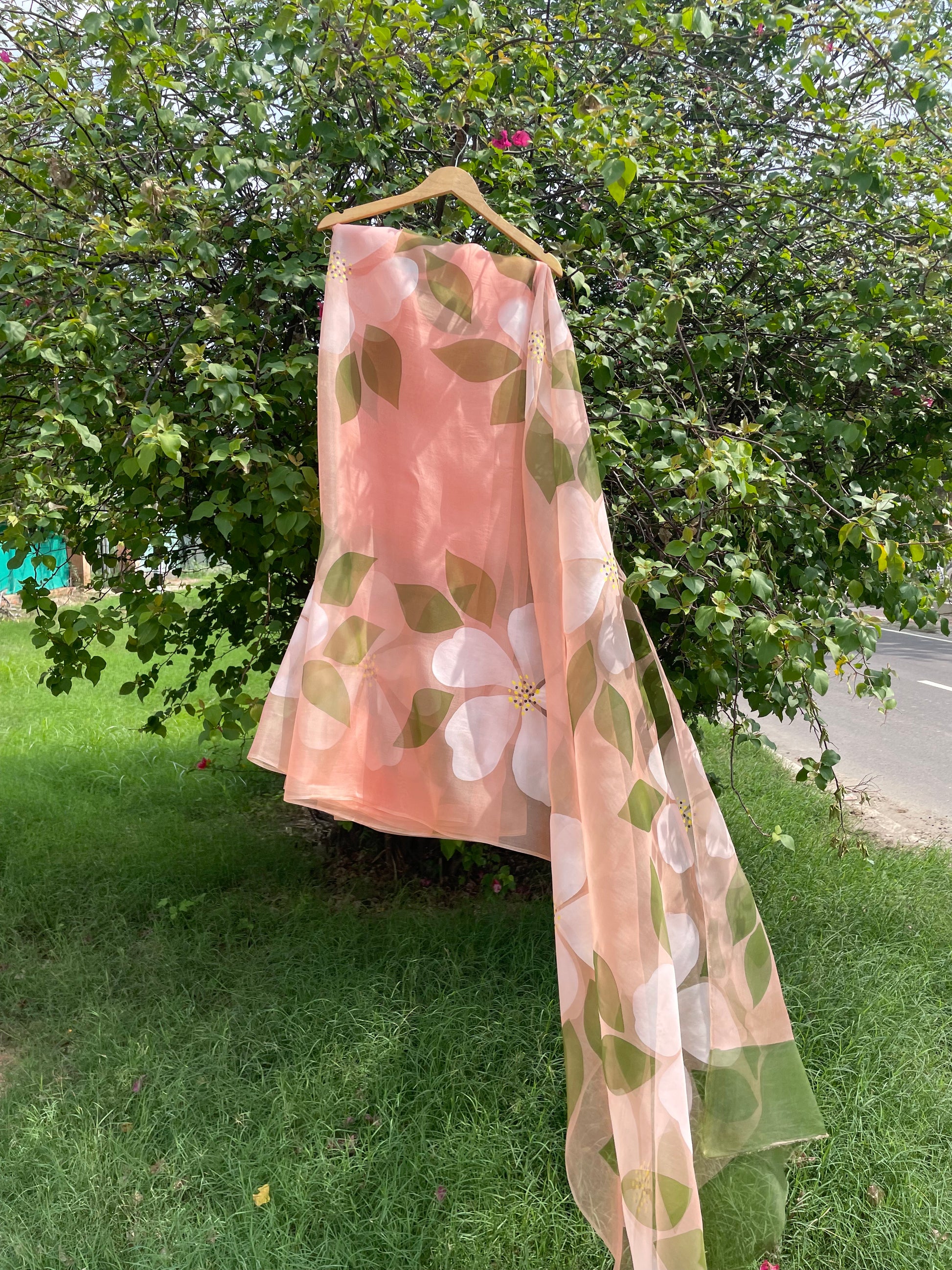 Big white hibiscus handpainted on peach pure silk organza saree .