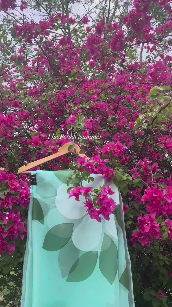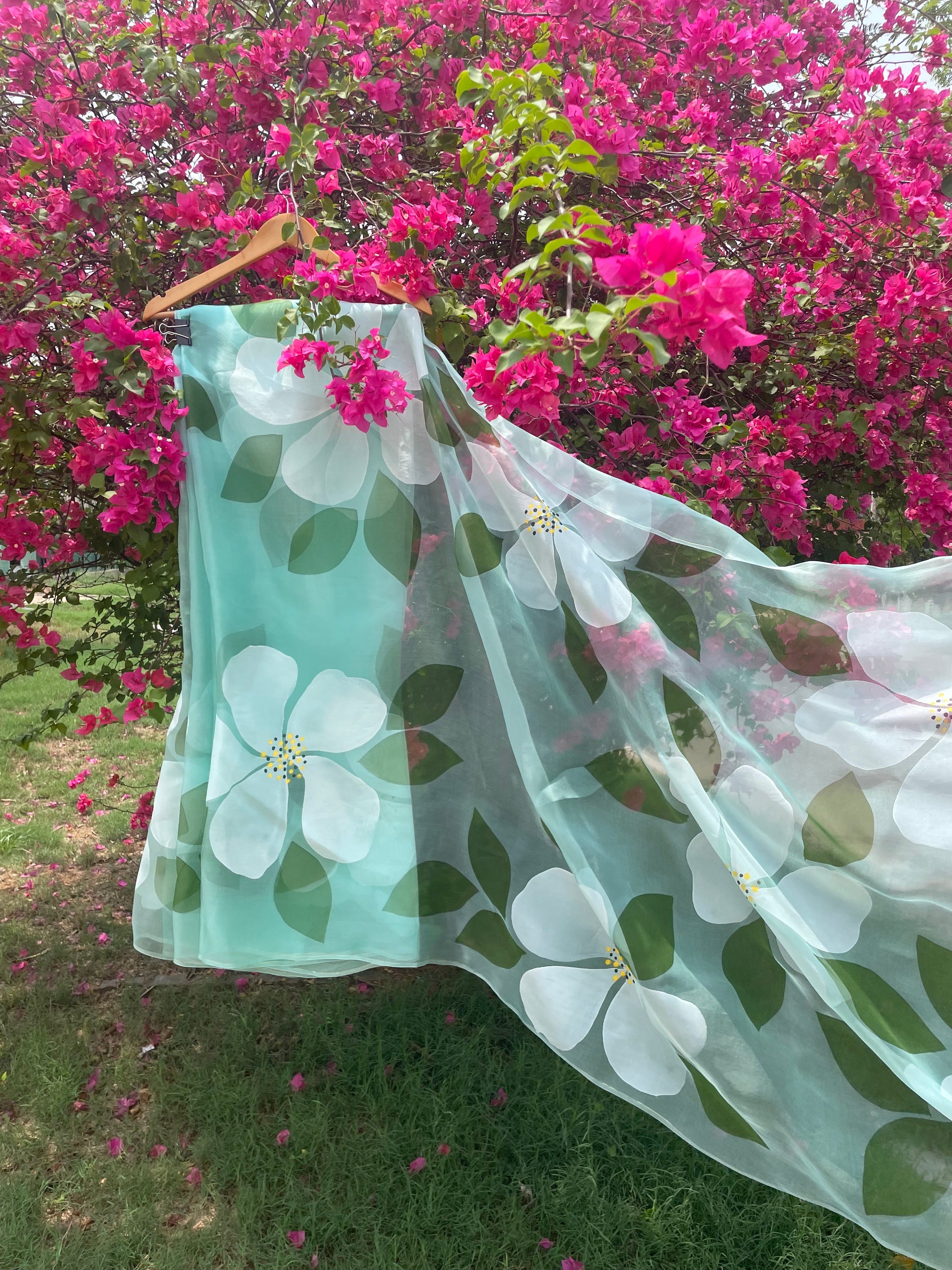 Transform your Haldi ceremony with elegance and grace! Presenting our exclusive handpainted white hibiscuses on pure silk organza saree, beautifully paired with a vibrant green color.