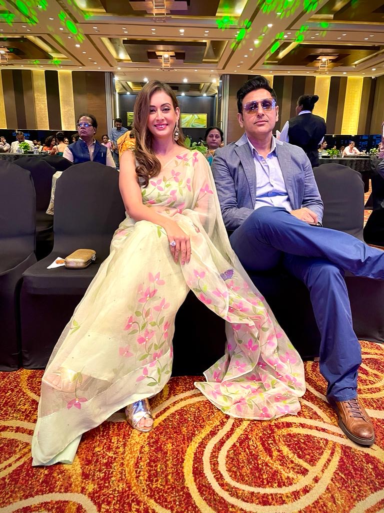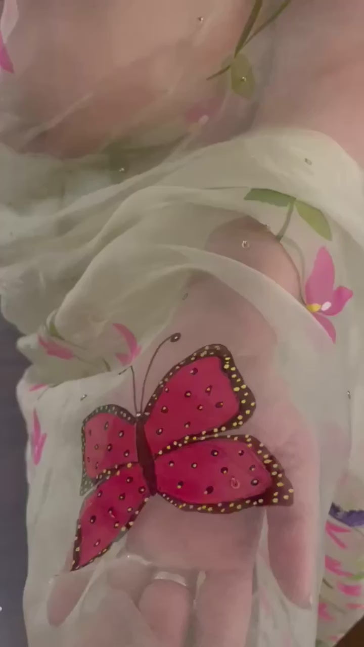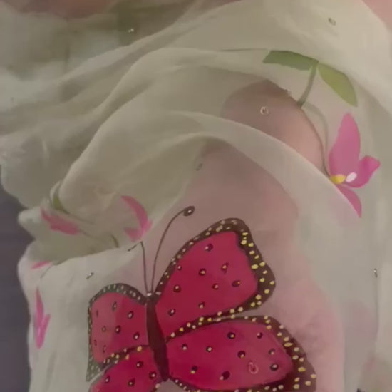 Handpainted pink bougainvilleas with colourful butterflies on pastel pista green organza saree. The saree is enhanced with golden sequins all over the Sree to give that extra shine.