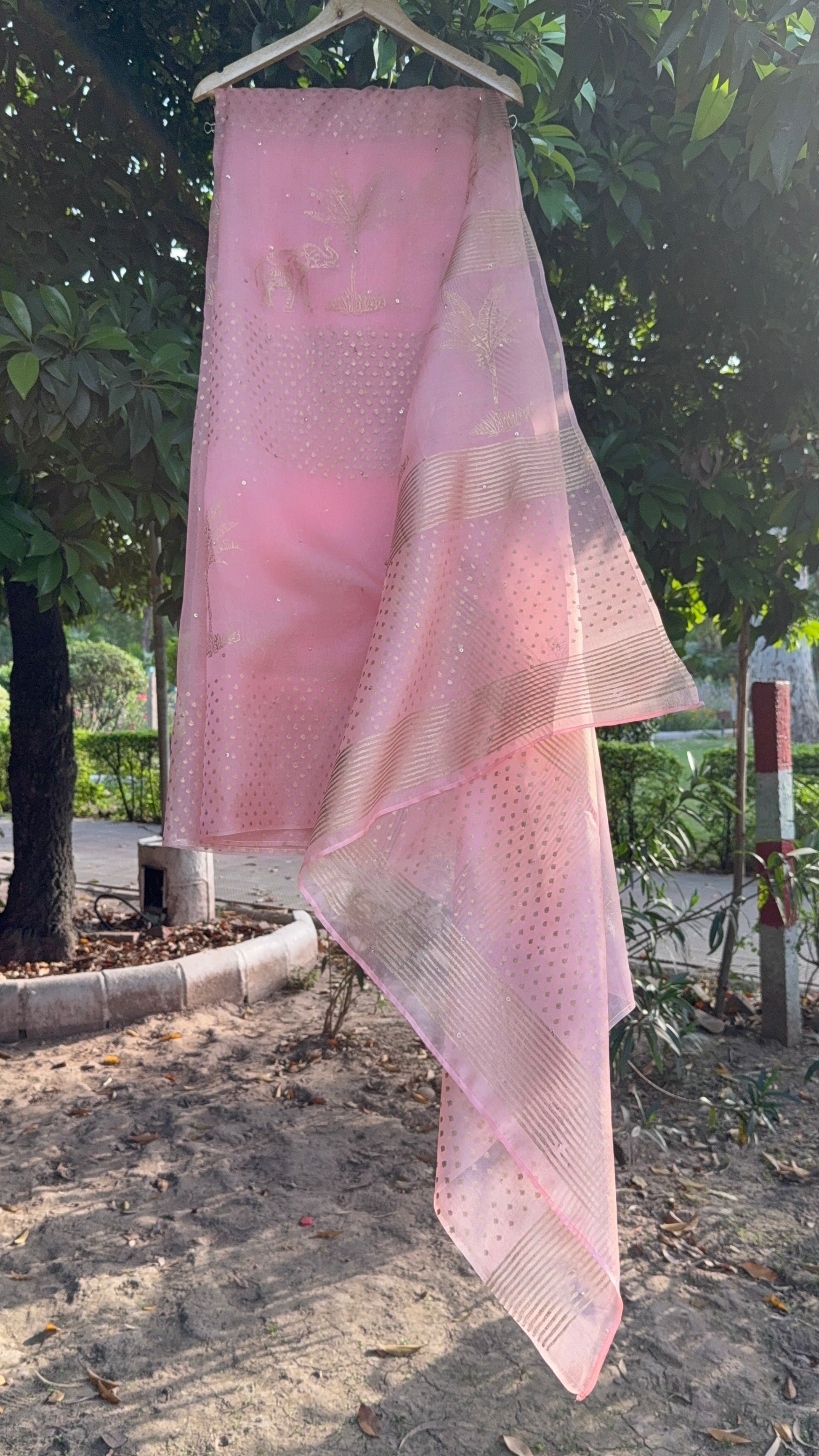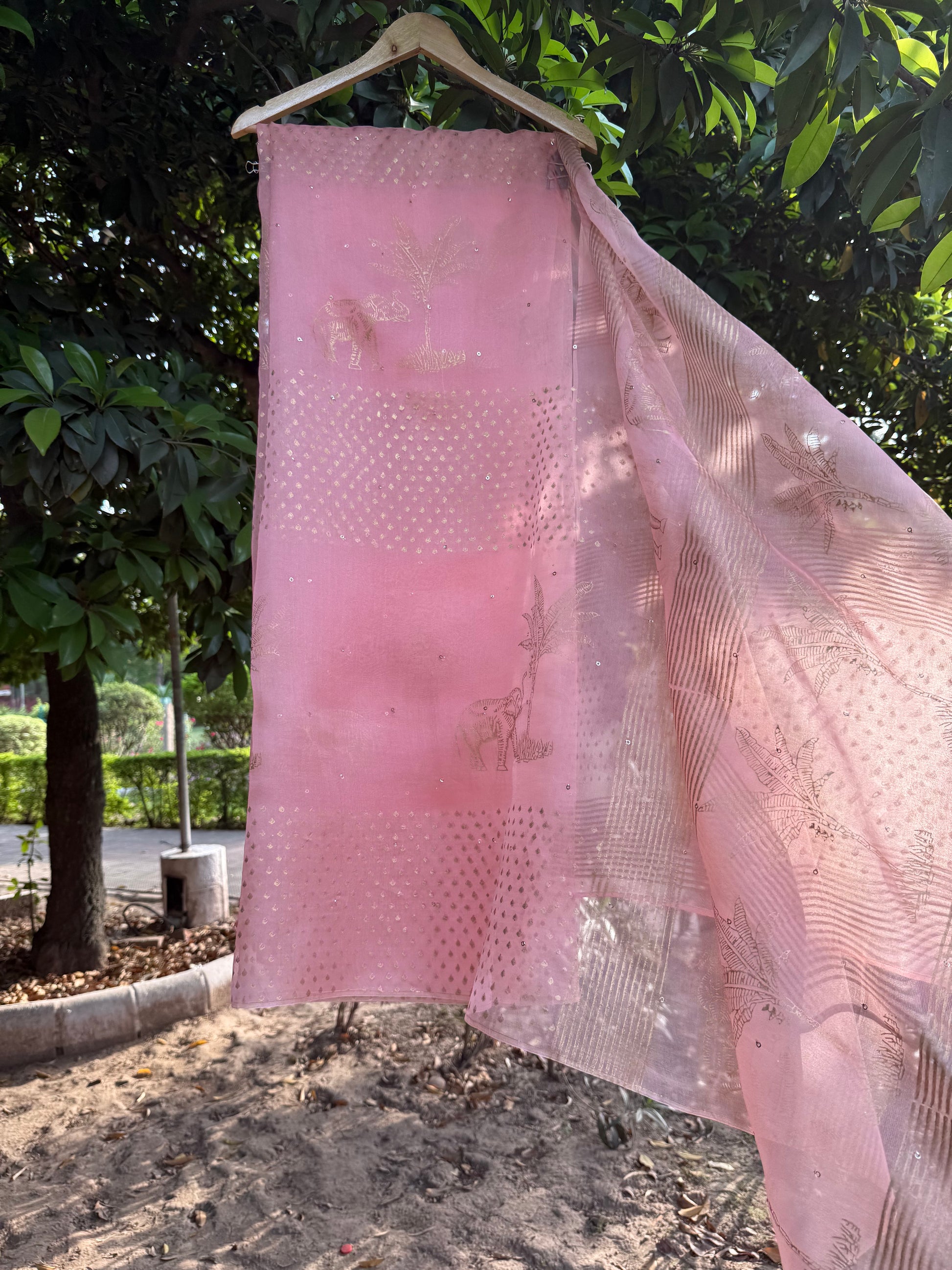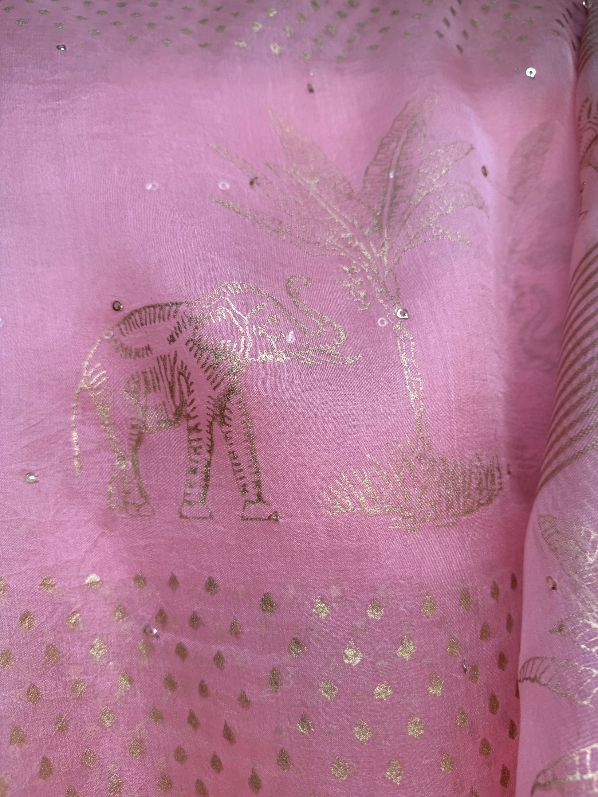 Luxurious pink pure silk organza saree, hand-block printed with striking elephants and tree motifs. Enhanced with all-over sequins and intricate block designs on the borders and pallu.
