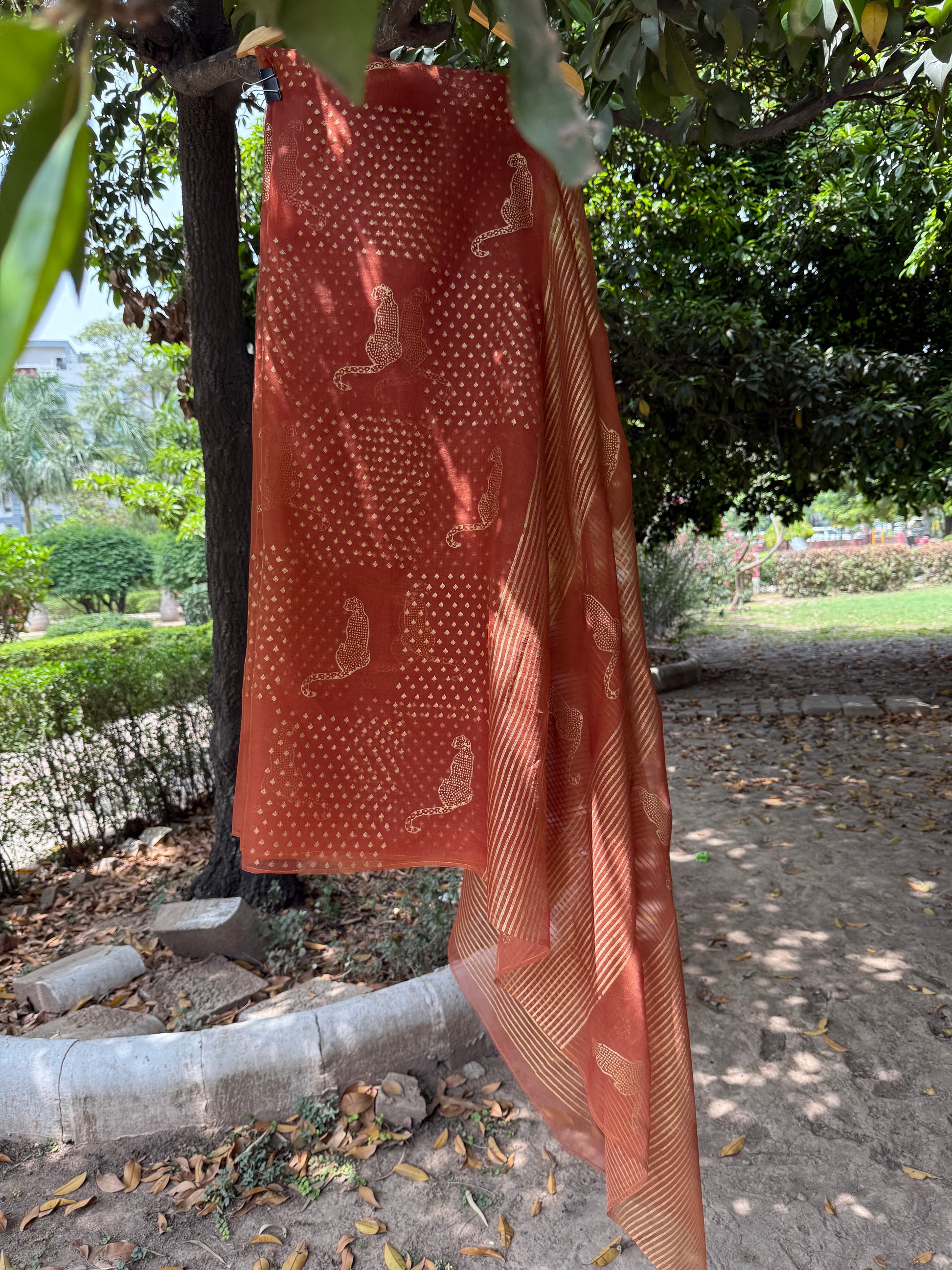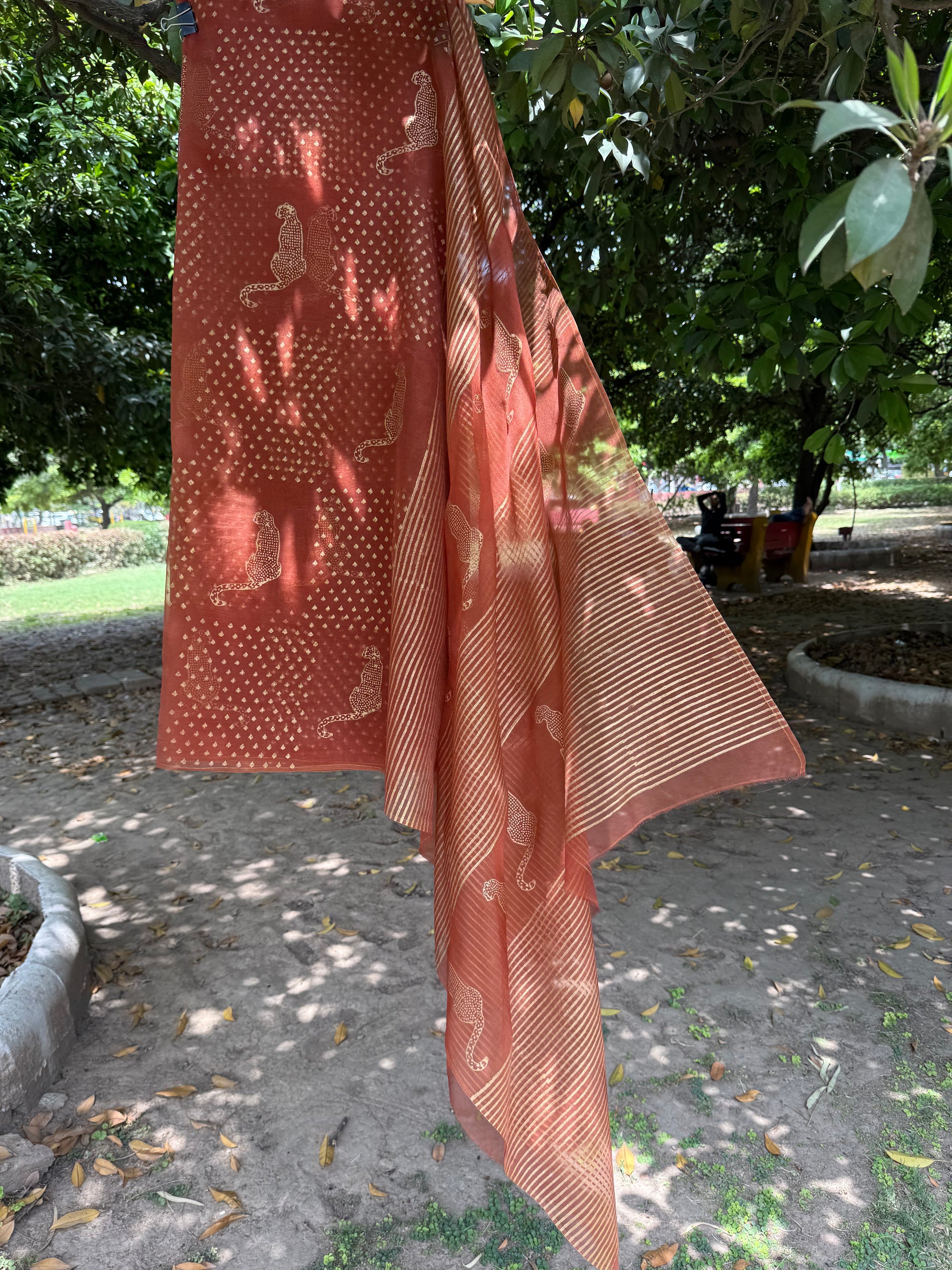 To preserve the beauty of gold block-printed pieces, always store them in a soft fabric cover. Keep away from dampness, direct sunlight, and excessive heat to prevent dullness or damage to the print. Dry clean only is recommended for long-lasting shine and elegance.