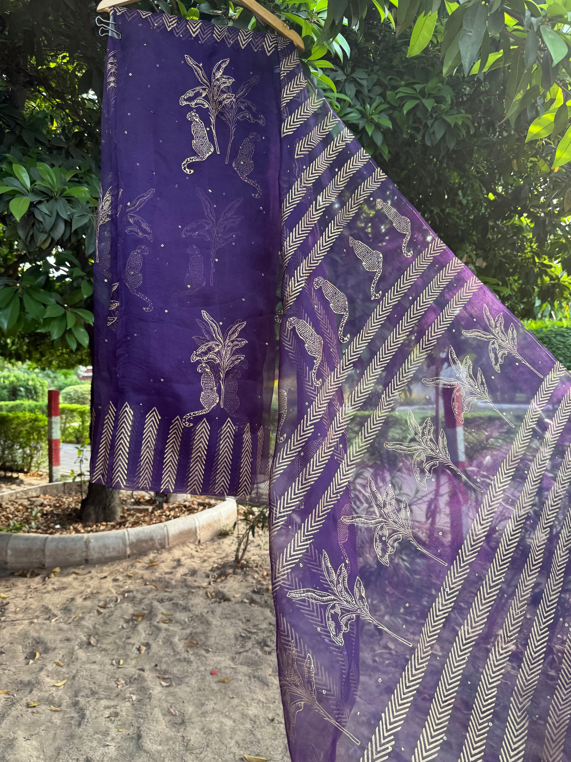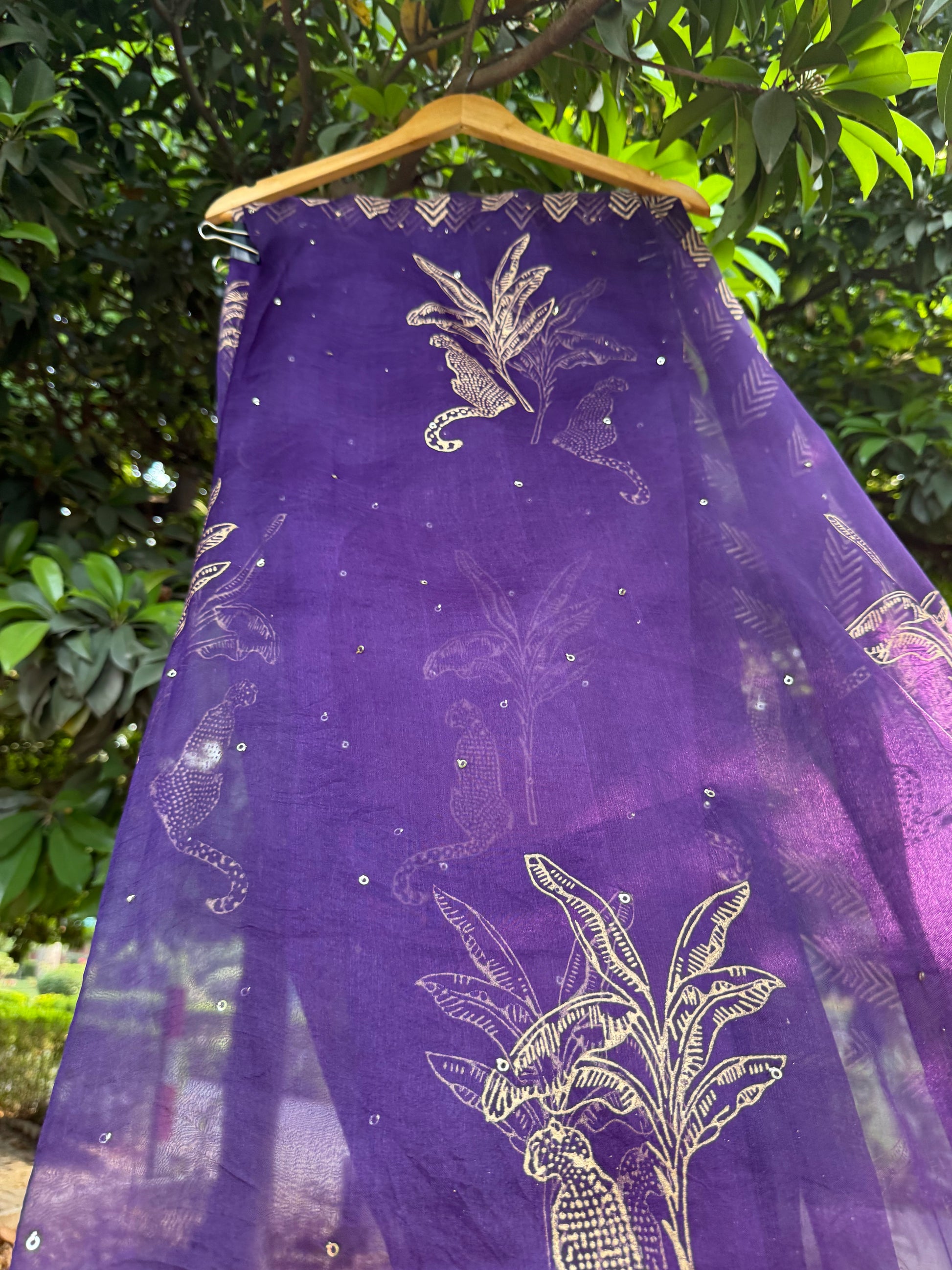 Luxurious purple pure silk organza saree, hand-block printed with striking leopard and tree motifs. Enhanced with all-over sequins and intricate block designs on the borders and pallu, this masterpiece celebrates the timeless artistry of hand block printing—transforming elegance into glamour.