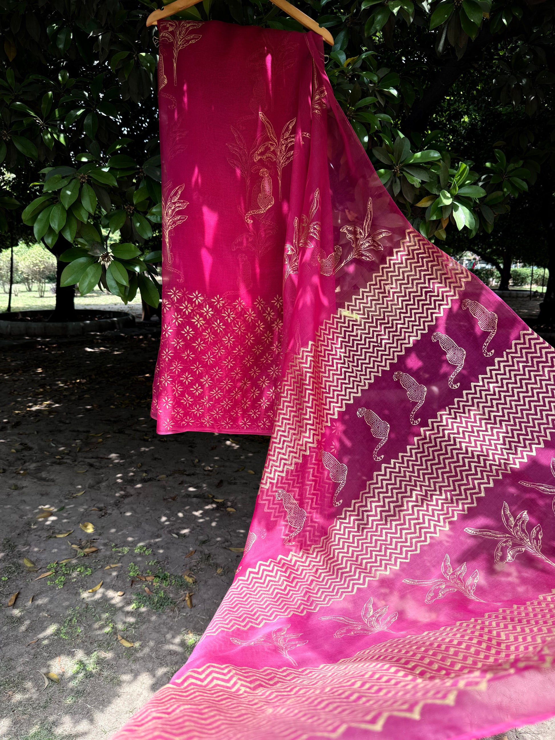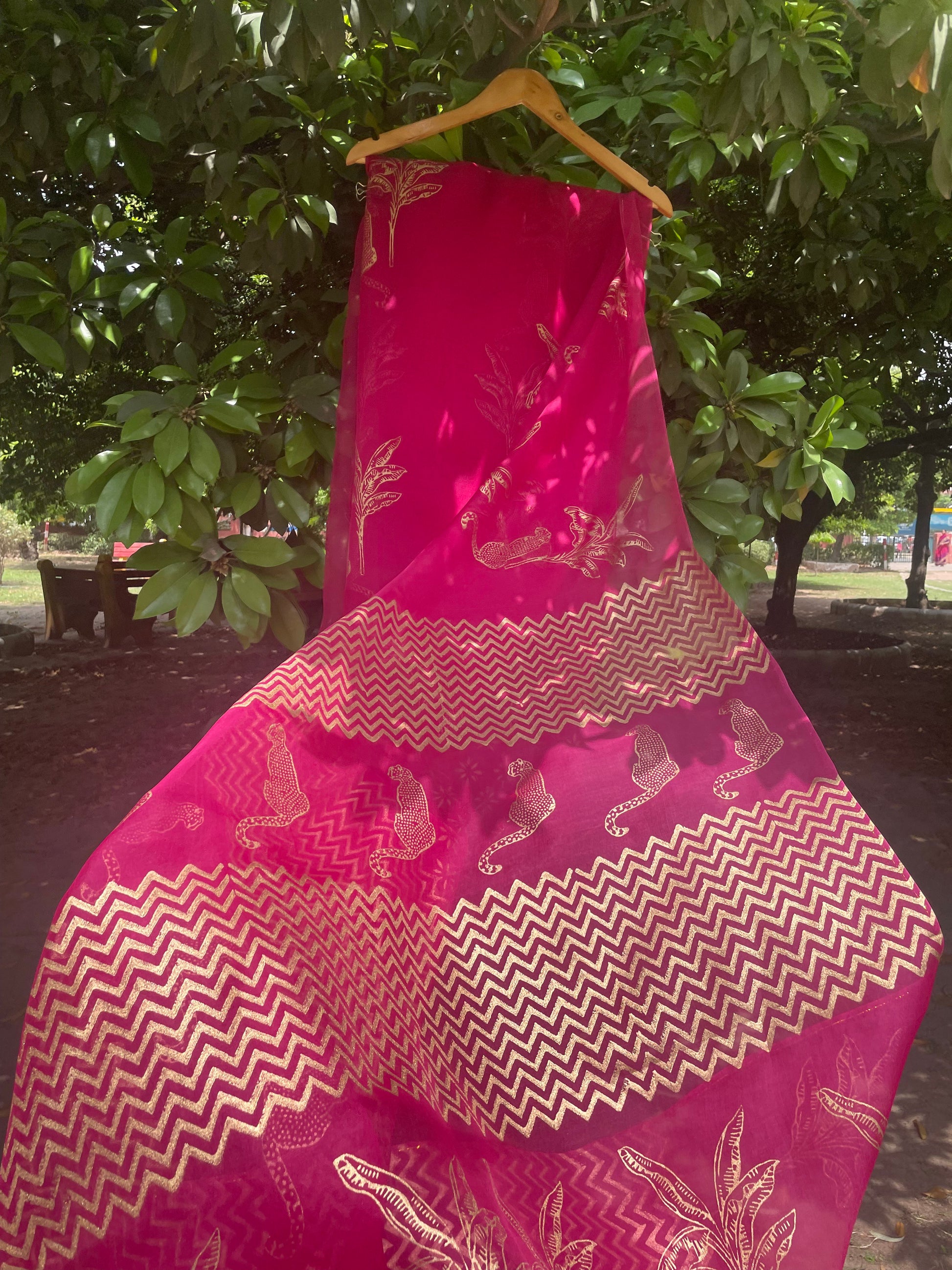An exquisite pure silk organza saree, hand-block printed with majestic gold leopard and tree motifs. Complemented by intricate block prints that flow seamlessly across the drape, this saree beautifully captures the elegance and grandeur of traditional block printing