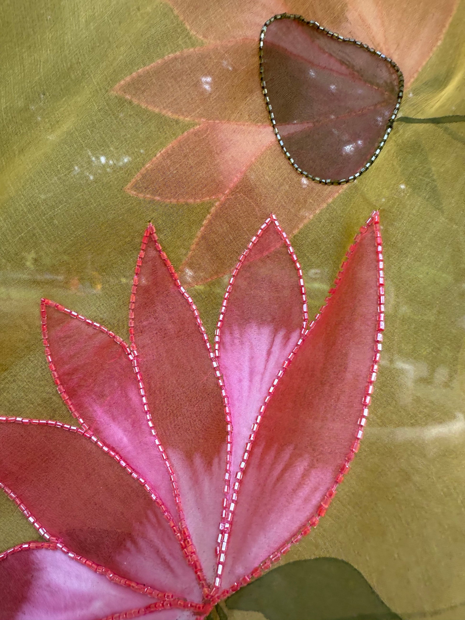 A radiant yellow chiffon suit adorned with hand-embroidered cutdana work on delicate pink lotuses, paired with a pure silk organza dupatta embellished with matching embroidery. An elegant and timeless piece of wearable art, perfect for adding sophistication to any occasion.