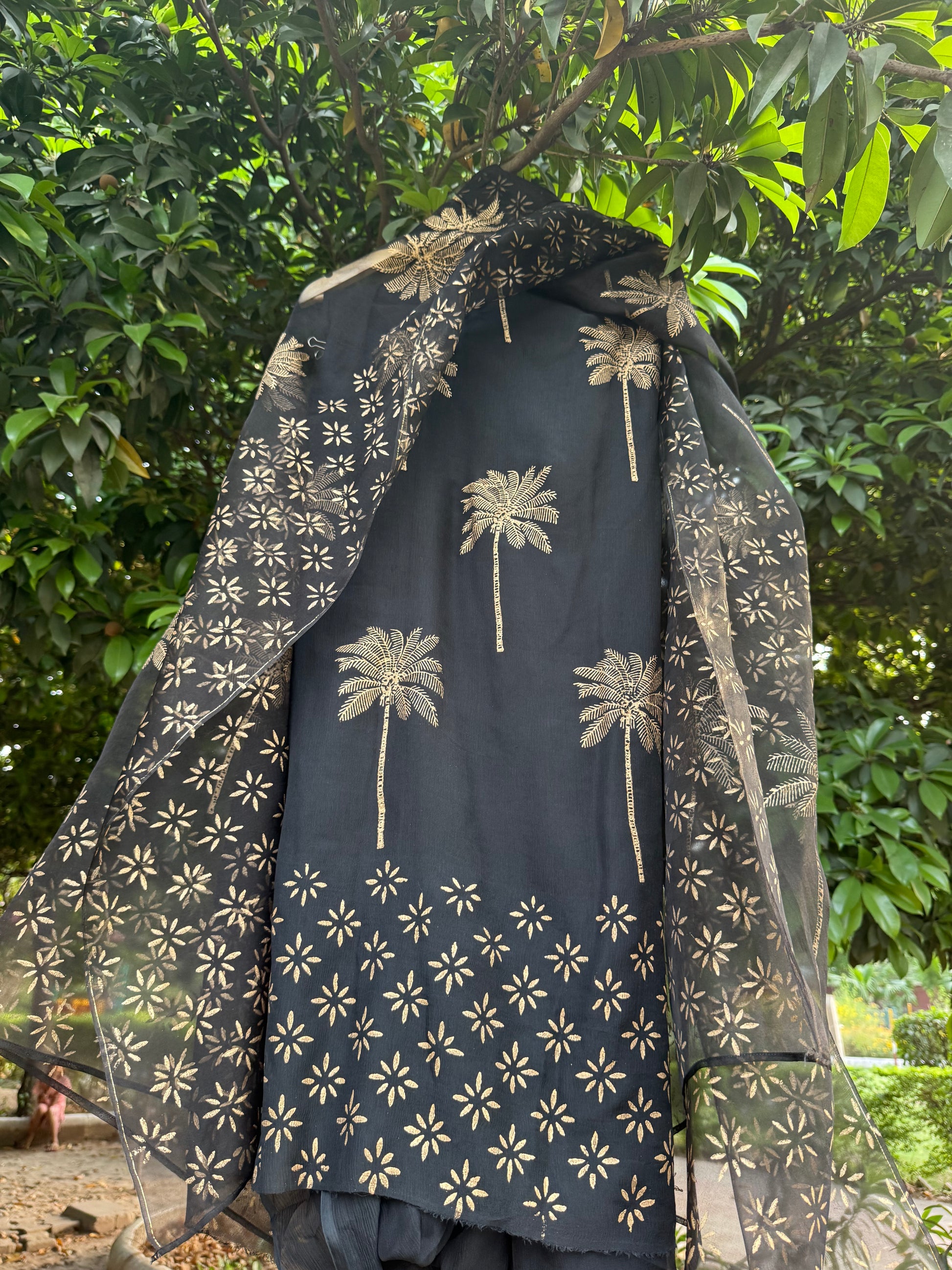 Graceful chiffon suit is adorned with hand-block printed golden palm tree motifs, beautifully complemented by intricate block designs. Paired with a pure organza dupatta, it blends lightness, elegance, and artistry—making it perfect for festive and special occasions.