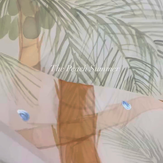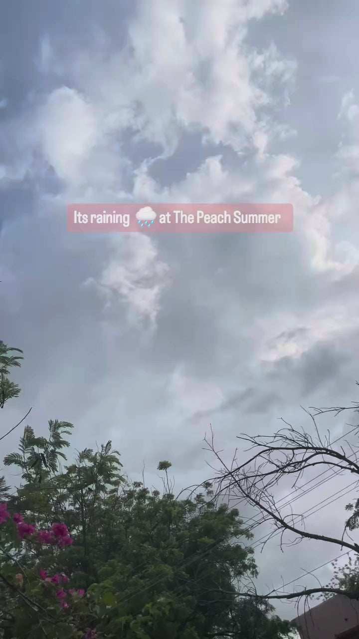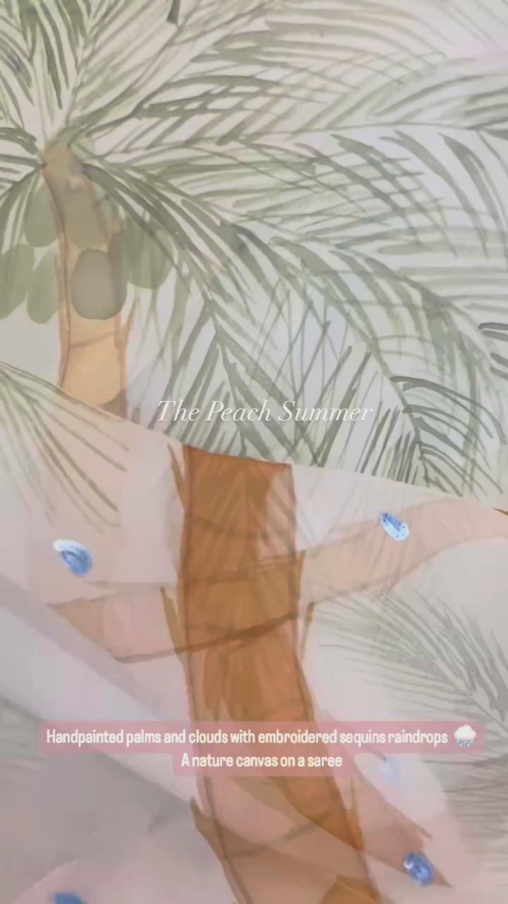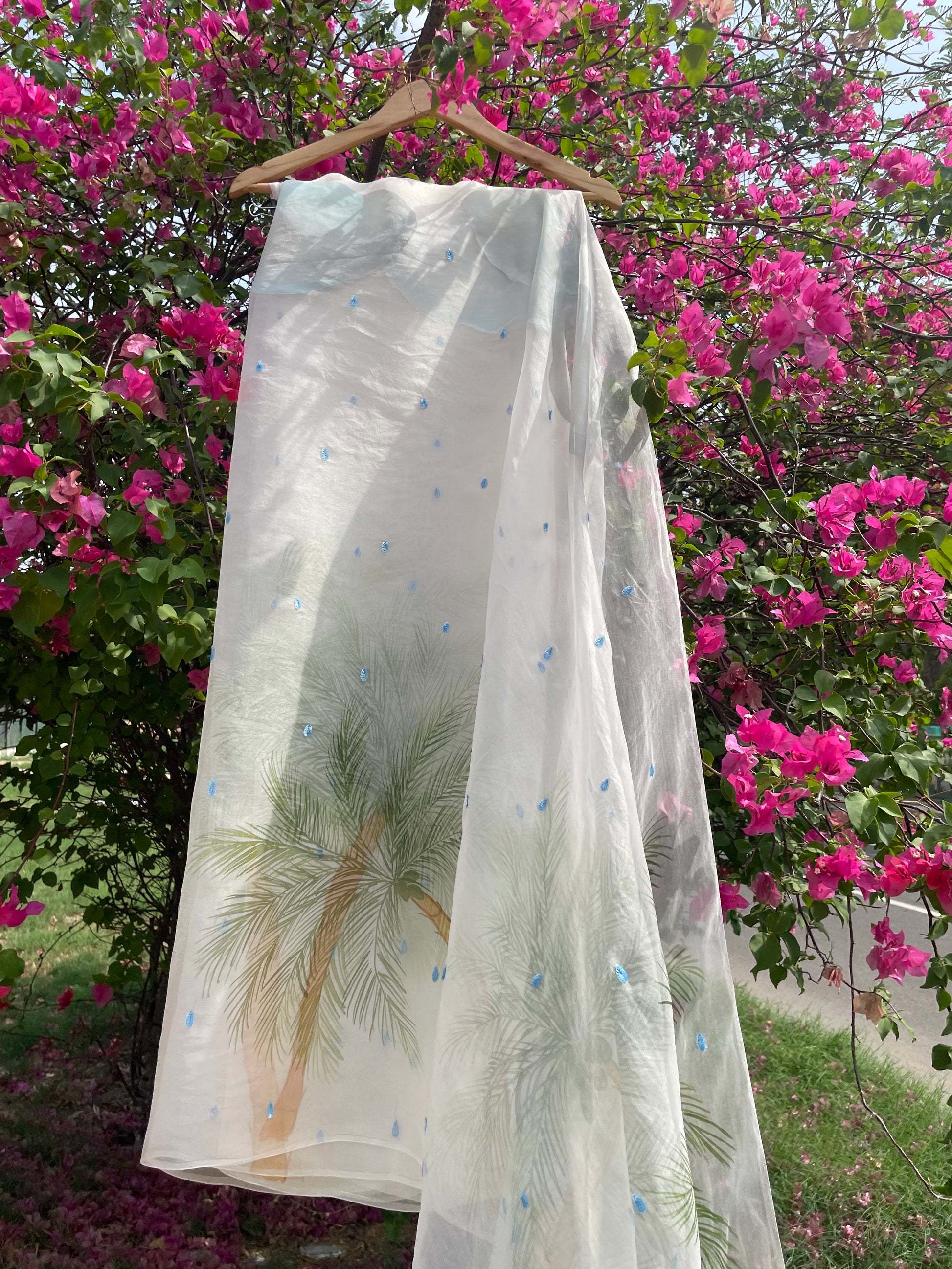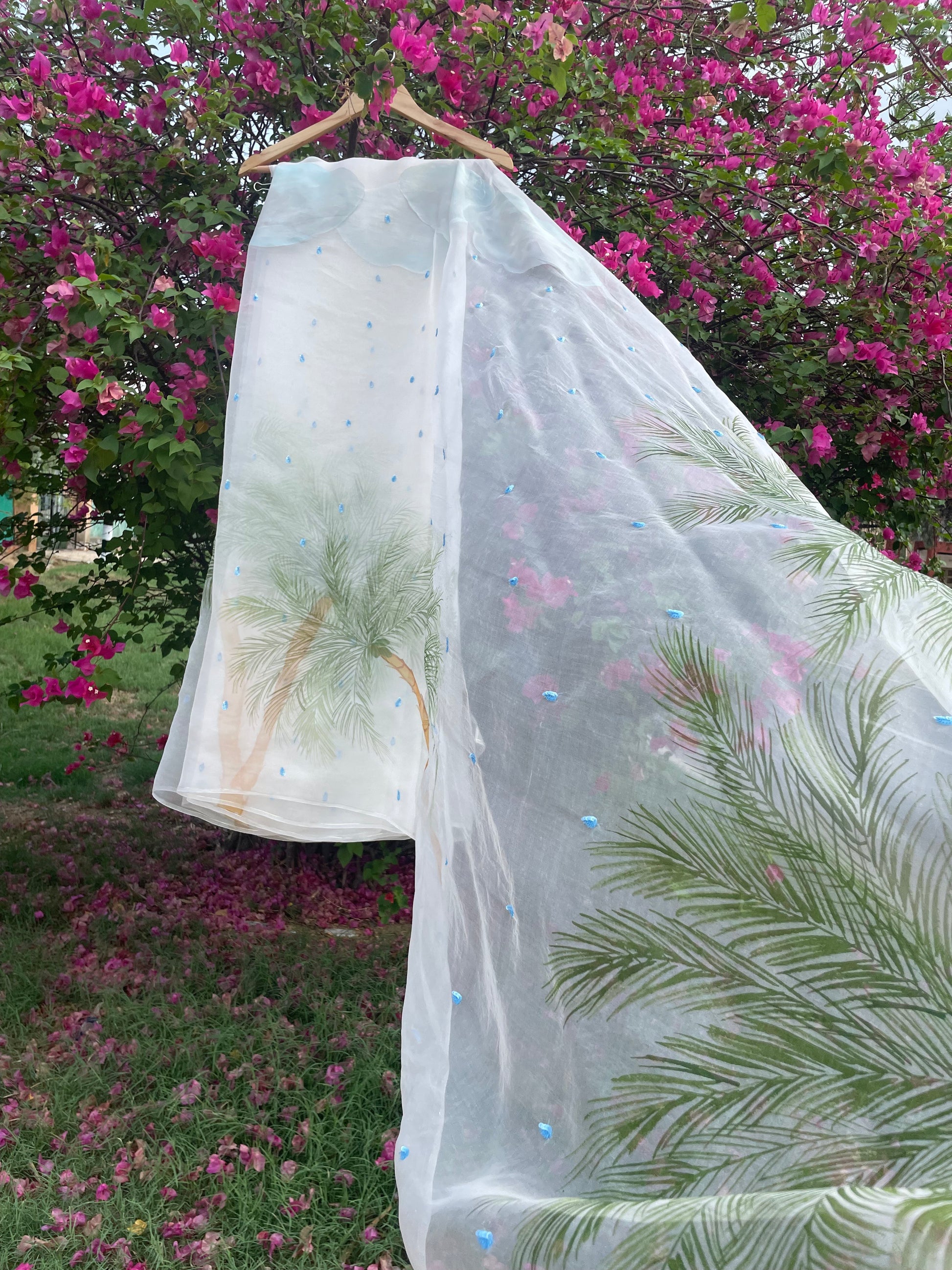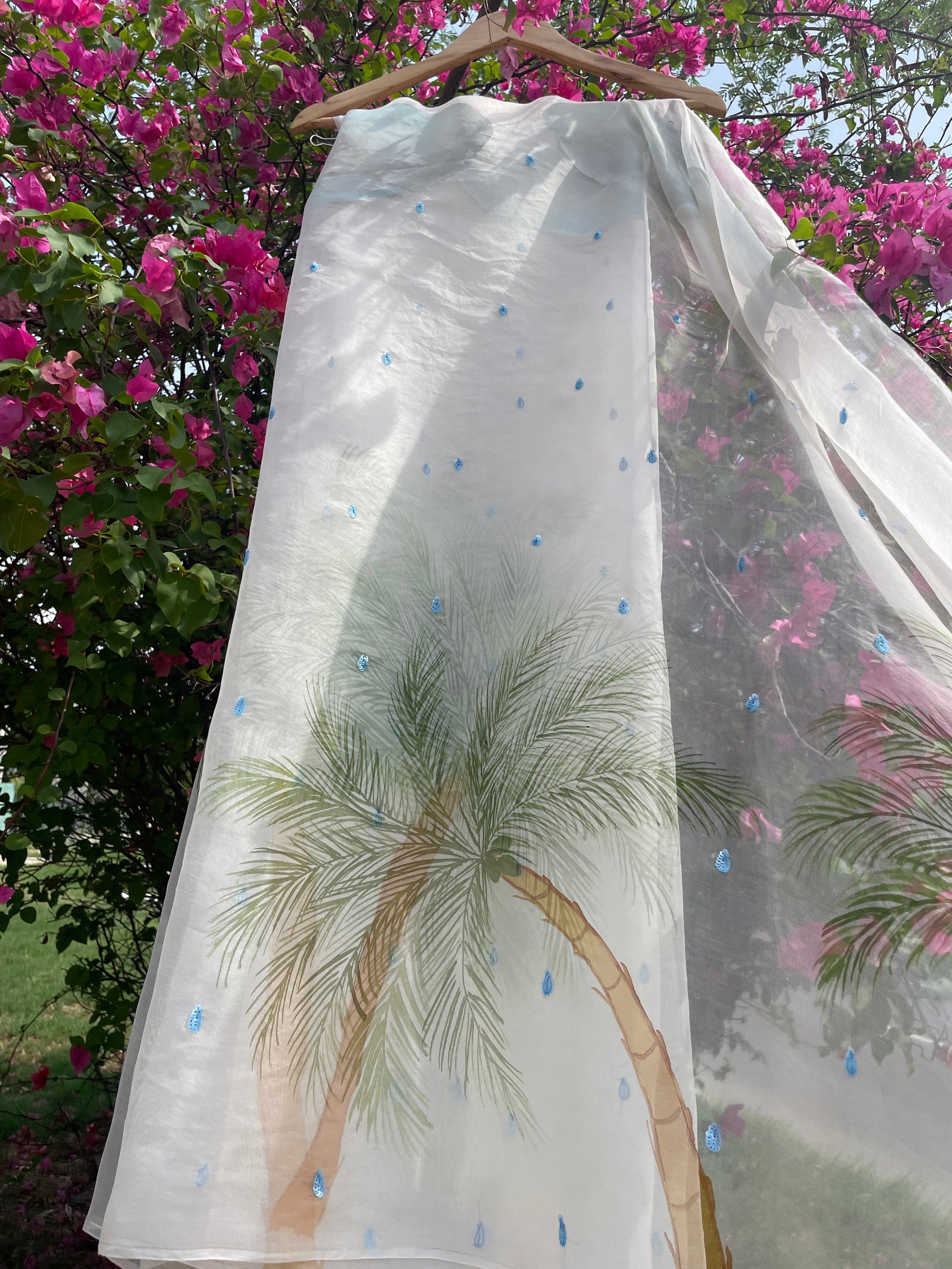 Handpainted with delicate palm trees and clouds showering raindrops, this saree is a true work of art. Each raindrop sparkles with hand-embroidered sequin work, adding a touch of magic to the scene.