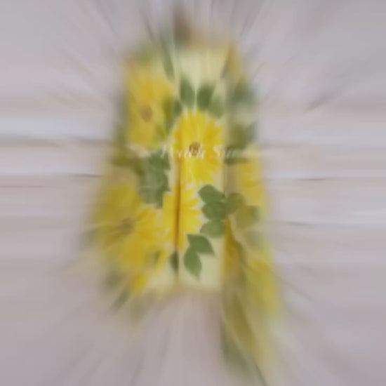 mbrace the warmth of sunshine with our handpainted sunflowers on pastel yellow crepe suit, paired with a pure silk organza dupatta adorned in golden sequins. Perfect for your haldi ceremony, this outfit radiates joy and beauty. Explore our exquisite handpainted collection and bloom with elegance.