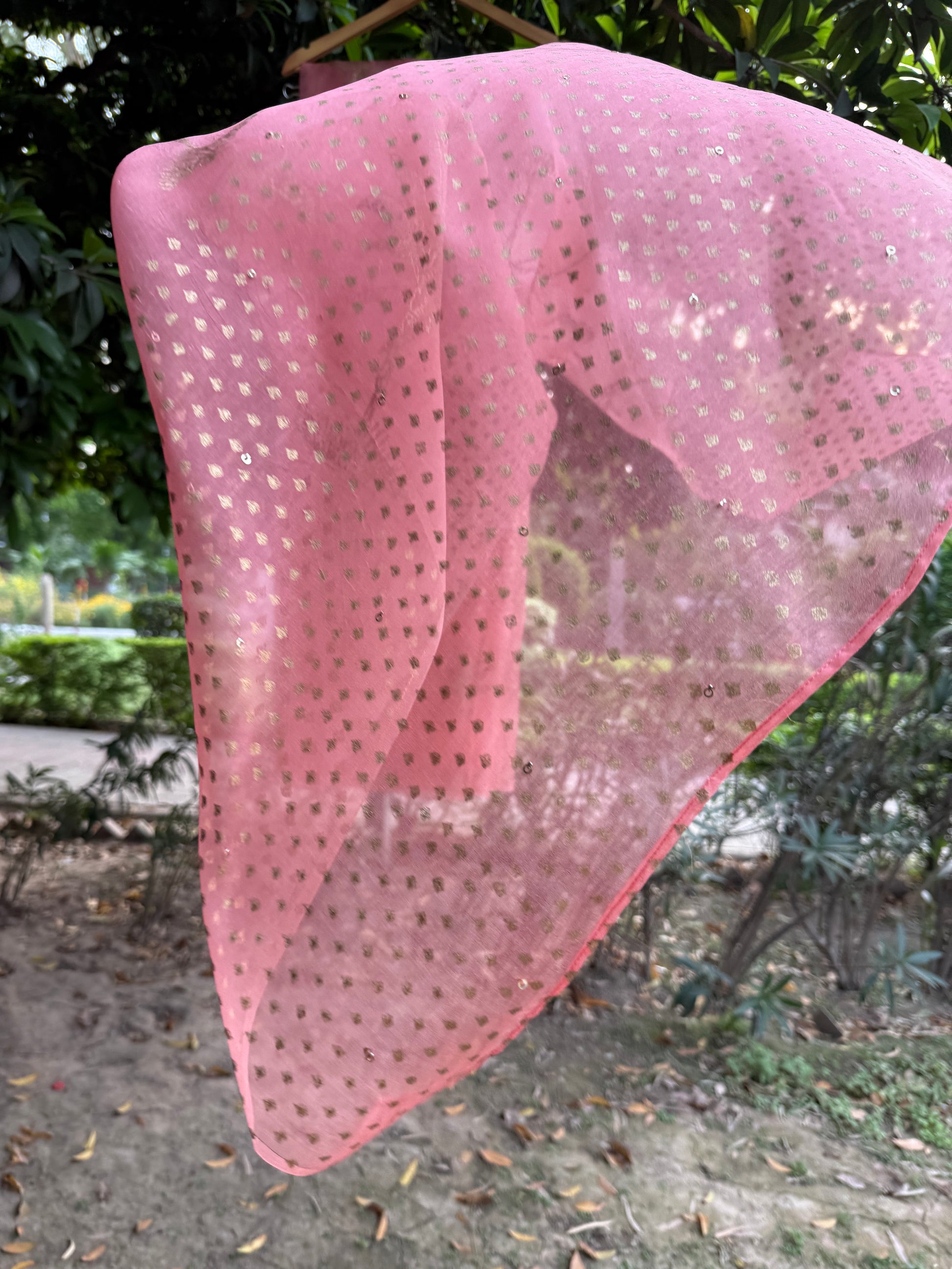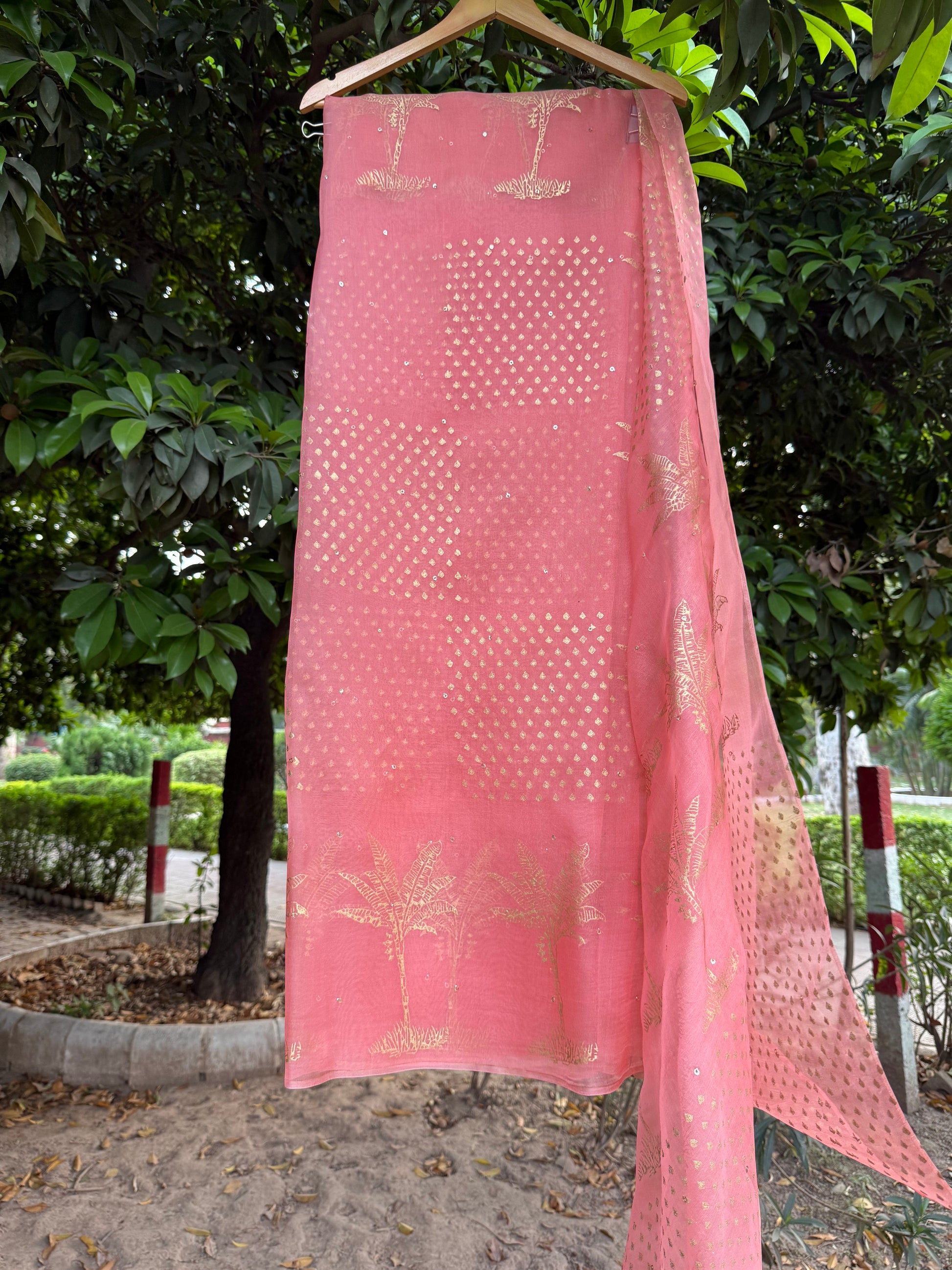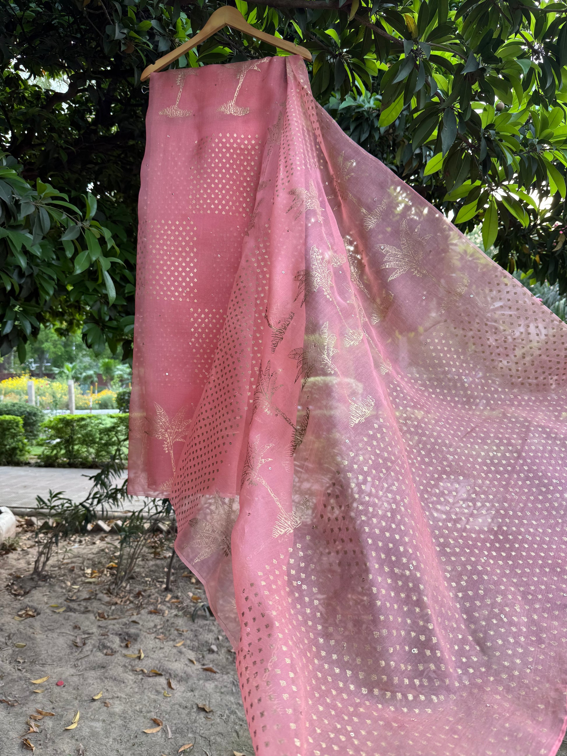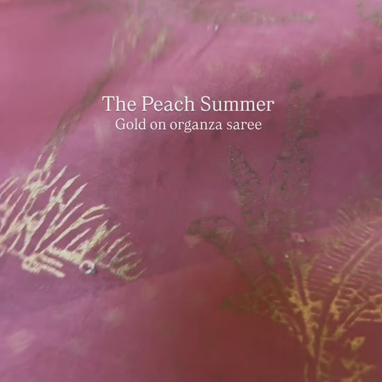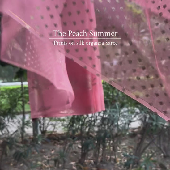 Introducing The Peach Summer’s very own handcrafted blockprints—starting with this pastel pink silk organza saree, kissed with golden sequins and timeless blockprint glam.
