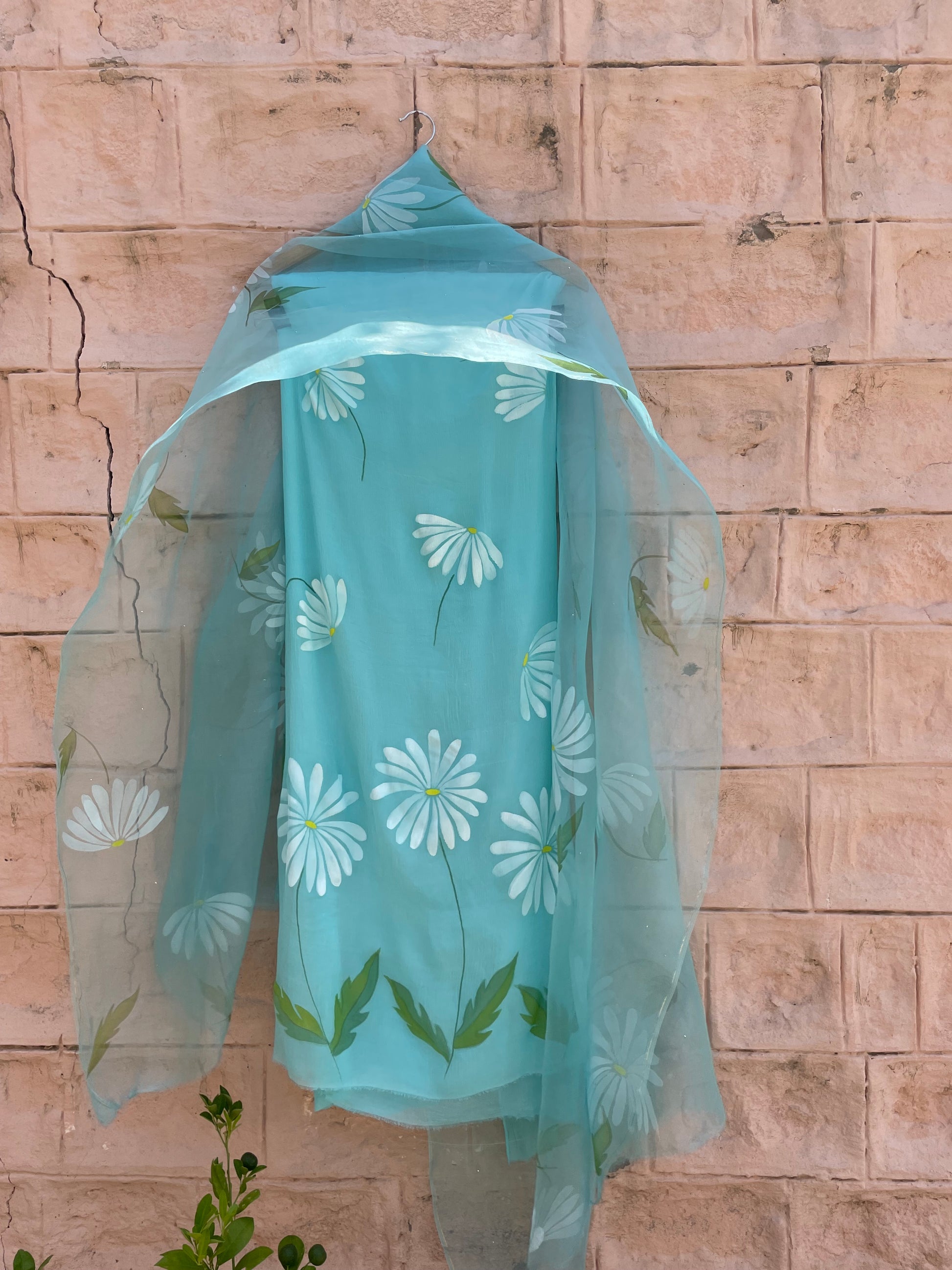 Slip into this enchanting hand-painted chiffon suit and let its delicate daisies transport you to a world of sun-kissed memories and endless possibilities.