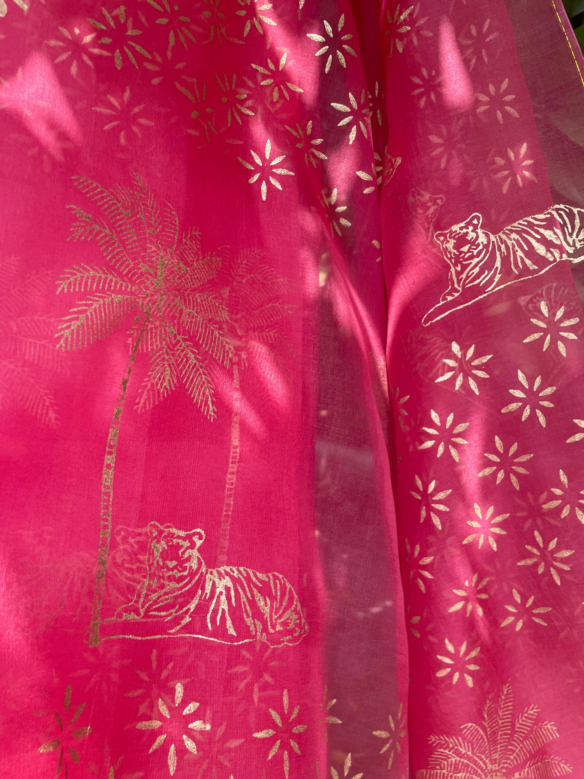 An exquisite pure silk organza saree, hand-block printed with majestic gold tiger and tree motifs. Complemented by intricate block prints that flow seamlessly across the drape, this saree beautifully captures the elegance and grandeur of traditional block printing.