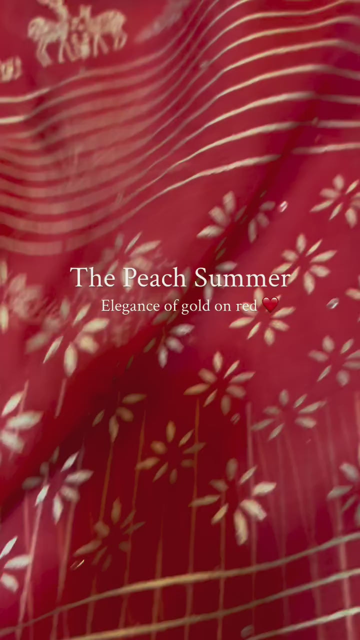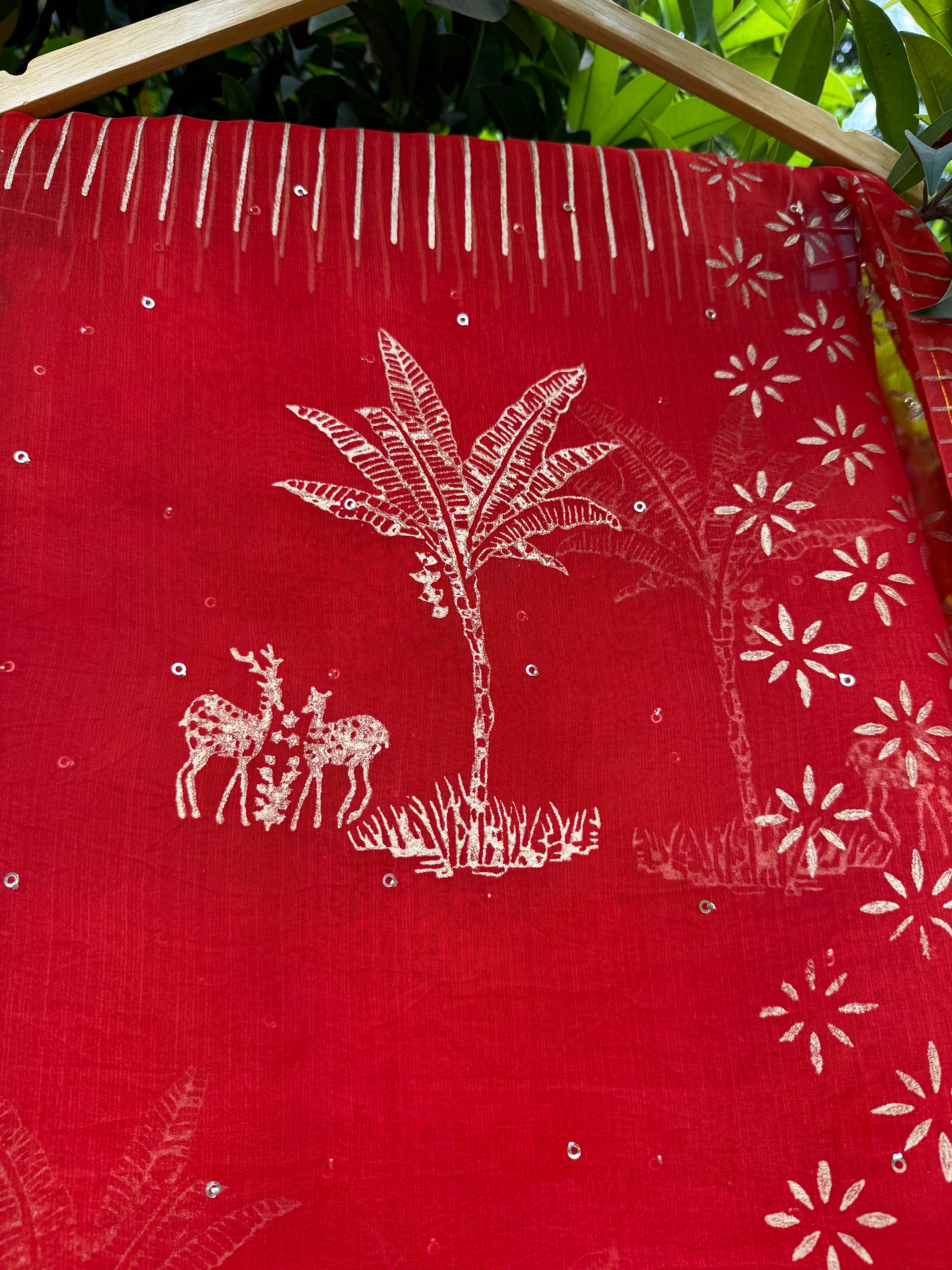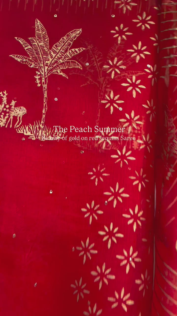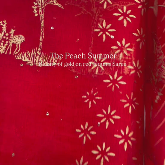 Hand-block printed in shimmering gold with graceful trees and deer motifs, and enhanced with delicate golden sequins — every drape tells a story of elegance and enchantment.